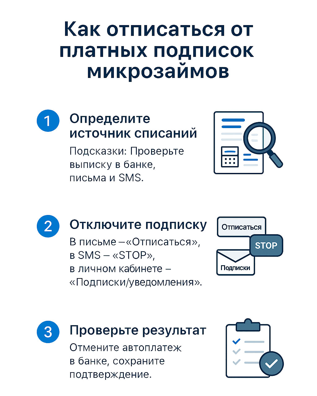 - в личном кабинете МФО/сервиса — выключите «подписки/уведомления/платные услуги»;